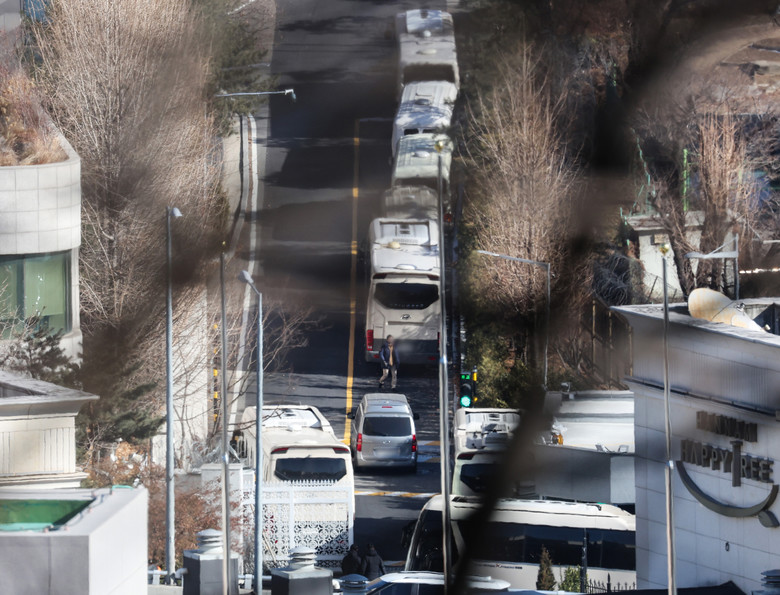 고위공직자범죄수사처의 윤석열 대통령 체포영장 2차 집행 시도를 앞둔 가운데 10일 오후 서울 용산구 한남동 대통령 관저 정문으로 차량이 들어서고 있다. 2025.1.10