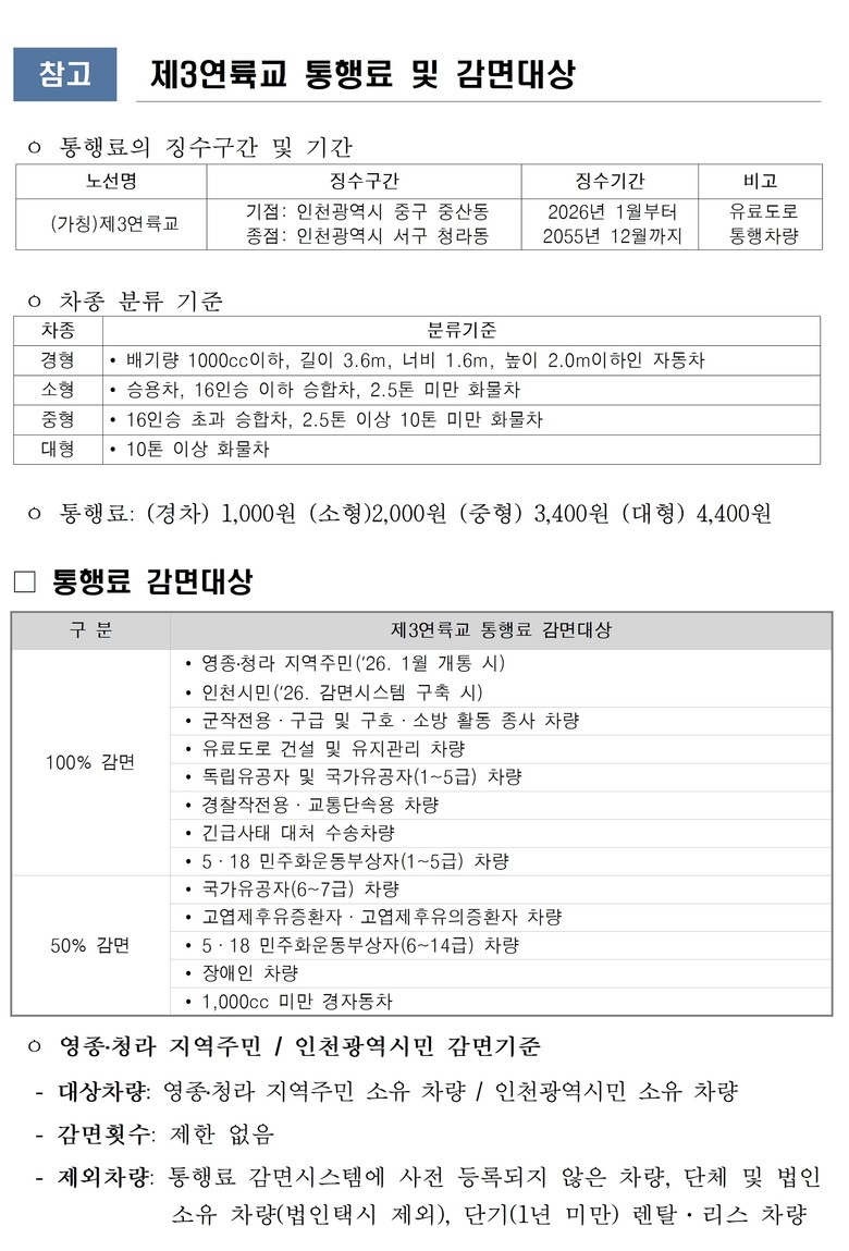 특히 “제3연륙교는 영종·청라 주민과 인천시가 함께 비용을 부담해 건설하는 사실상의 공공사업”이라며, “시민이 이미 분양가와 세금으로 기여한 만큼 인천시민 무료화는 당연한 권리”라고 강조했다.