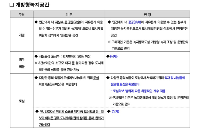 입체 녹지공간 기준, 개방형녹지 토심기준, 개방형녹지 인정한도 기준에 대해서는 현재 운영중인 ‘녹지생태도심 개방형녹지 조성 및 운영관리 기준’을 통해 관리할 계획이다.