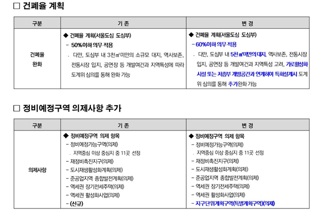개방형녹지 의무비율 삭제에 따라 저층부 개방공간 유도 등 합리적 계획이 가능하도록 기존 50퍼센트 이하 기준을 60퍼센트 이하로 완화하였다