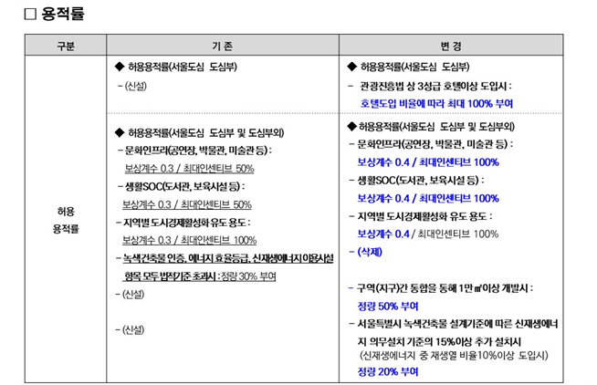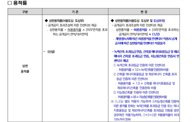 또한, 녹색건축물 인증, 건축물 에너지효율등급 및 제로에너지 건축물 등급 인증에 따른 친환경 인센티브는 상한용적률로 변경하여 친환경 정책에 적극 대응할 수 있도록 하였다.