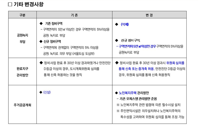 기타, 정비사업 완료지구 재재개발시 증개축도 가능하도록 변경하고,주거 도입 확대를 위해 노인복지주택을 주거용도로 허용한다.