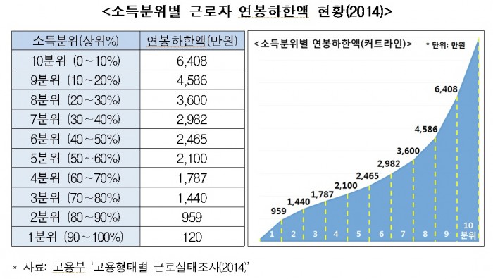 고용주, 자영업자 등을 제외한 임금근로자 중 상위 10%에 해당하는 근로자의 연봉은 6408만원 이상이었고, 상위 20%는 4586만~6408만원, 상위30%는 3600만~4586만원이었다.