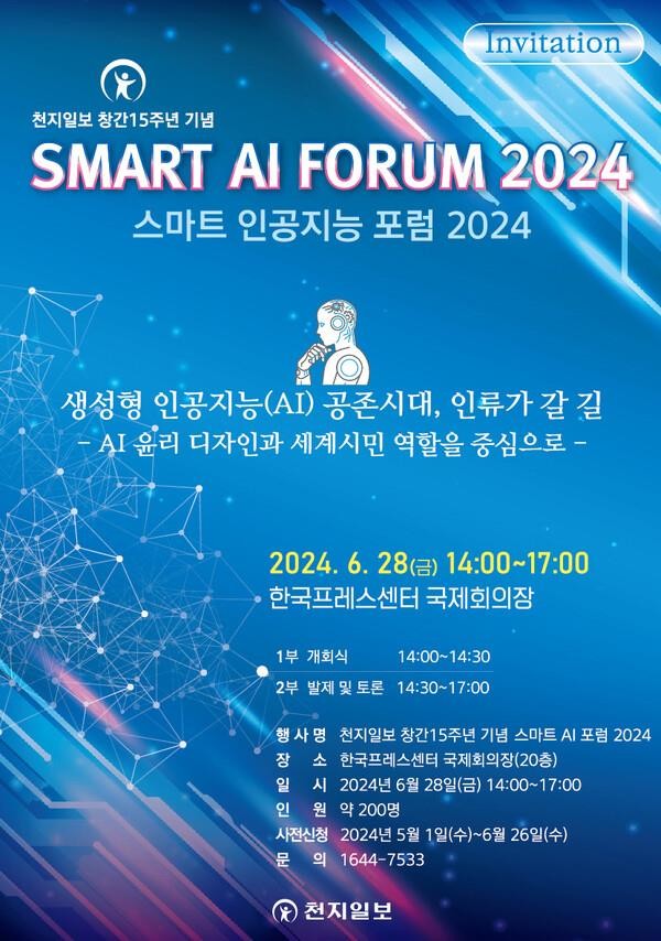 전국종합일간지 천지일보(대표이사 이상면)는 오는 6월 28일 금요일 오후 2시부터 5시까지 서울 중구 한국프레스센터 국제회의장에서 ‘생성형 인공지능(AI) 공존시대, 인류가 갈 길-AI윤리와 세계시민의 역할을 중심으로’라는 주제로 ‘2024 스마트 AI 포럼’을 개최한다.