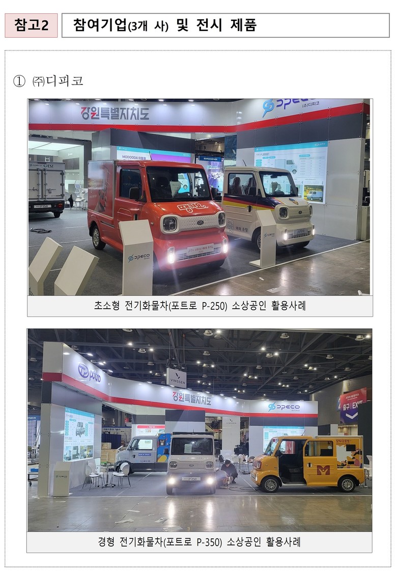 - 완성차기업 : 횡성 기업 ㈜디피코의 초소형 전기화물차 ‘포트로’를 중심으로 다양한 소상공인 특장 활용 사례(경찰서 순찰차량, 스티커사진부스, 전통시장 배송차량 등)와 후속 PBV(Purpose Built Vehicle) 개발 계획