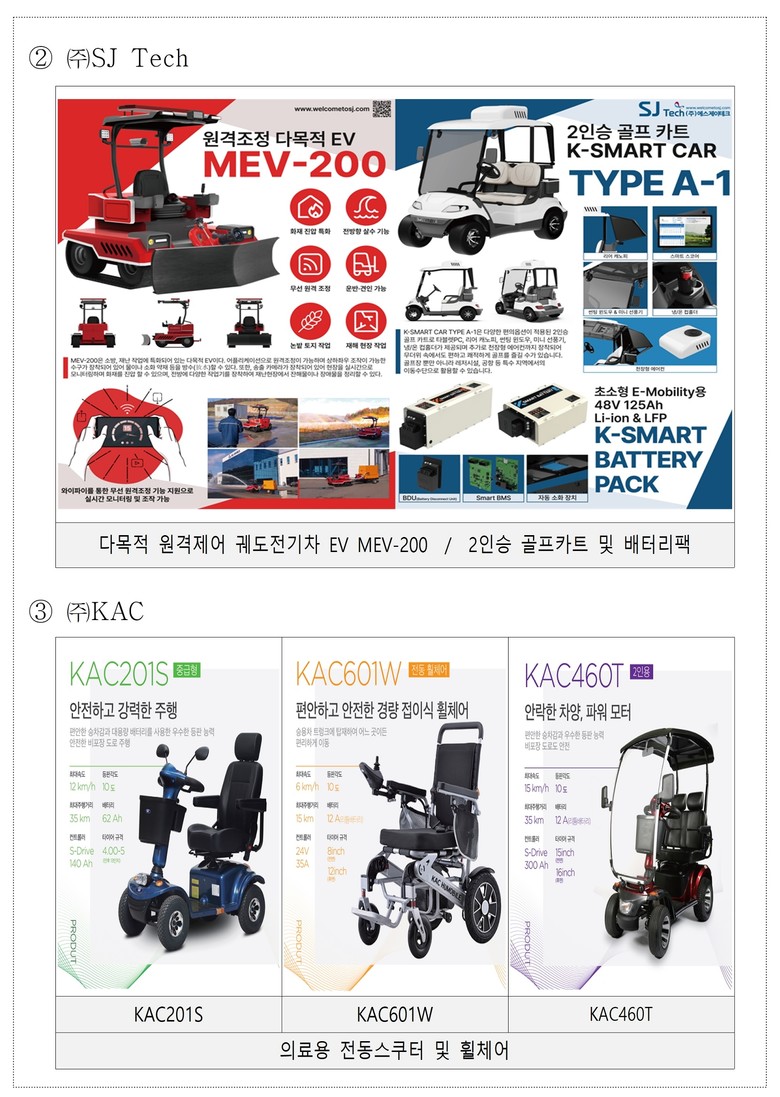 - 부품기업 : 횡성 기업 ㈜에스제이테크의 다목적 원격제어 궤도 전기차량과 배터리팩 제품, 원주 기업 ㈜케이에이씨의 의료용 전동스쿠터ㆍ휠체어