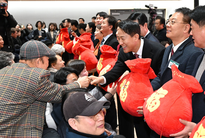 ▲ 오세훈 서울시장이 6일(화) 열린 '2026년 동작구 신년인사회'에서 복주머니 전달 퍼포먼스를 하며 구민에게 인사하고 있다.