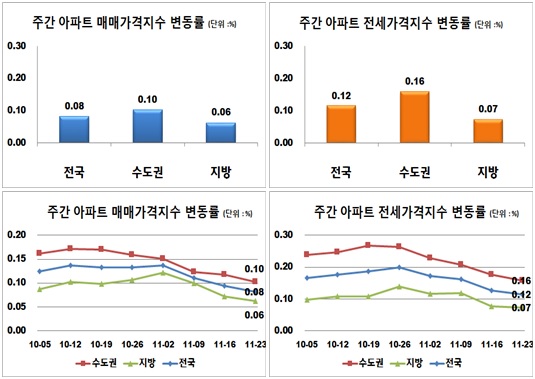 수도권(0.10%)의 경우 서울, 경기, 인천 모두 상승폭이 둔화됐고, 지방(0.06%)은 제주의 상승세가 지속됐다.