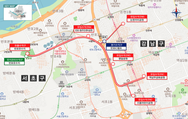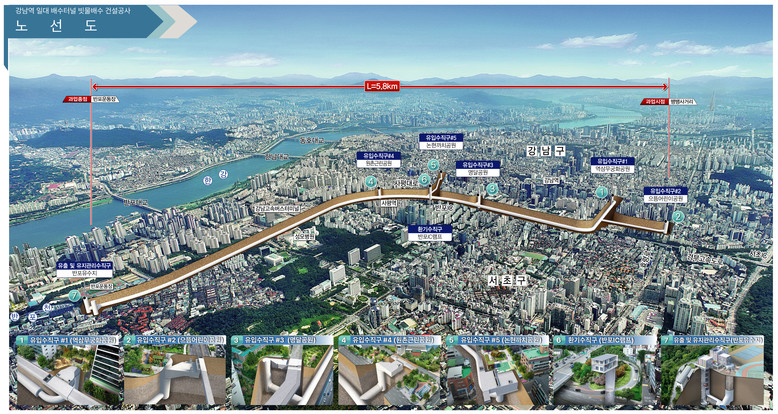 ※ 설치 구간은 강남구 역삼동에서 반포유수지까지 본선 4,518미터, 지선 1,282미터에 이른다. 도로 지하공간을 적극 활용해 침수 피해를 줄이는 것이 목적이다.