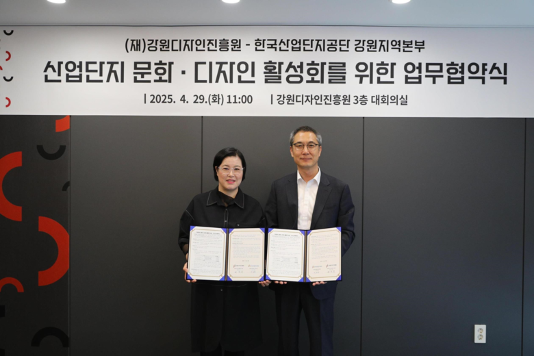 [강원도 세계타임즈=김민석 기자] (재)강원디자인진흥원(원장 최인숙, 이하 진흥원)과 한국산업단지공단 강원지역본부(본부장 이규헌)는 4월 29일 강원디자인진흥원 대회의실에서 산업단지 내 문화·디자인 활성화를 위한 업무협약(MOU)을 체결하였다.