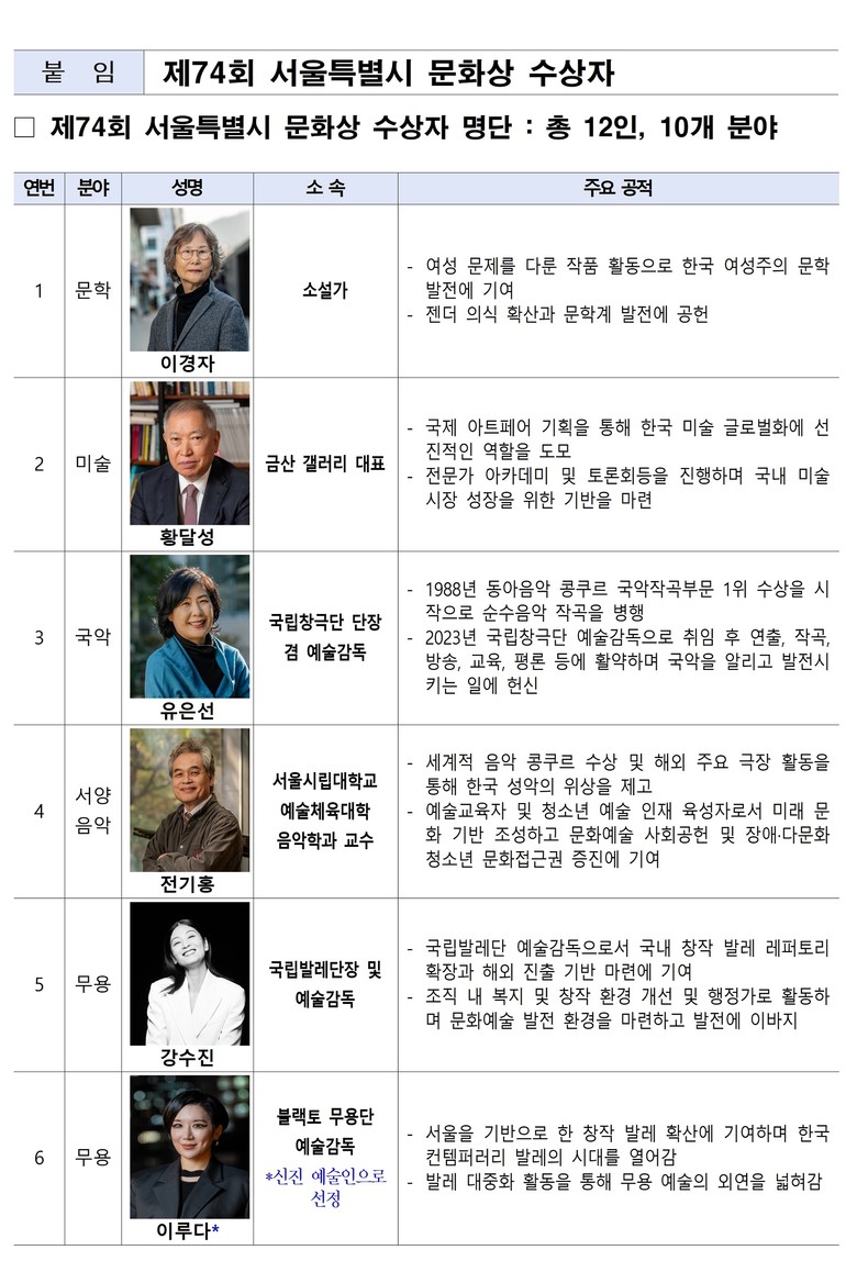 - 문학 이경자 소설가, 무용 강수진 단장, 문화산업 양희은 등 다양한 분야의 문화인들 수상 [서울 세계타임즈=이장성 기자] 서울시는 서울의 문화예술 발전에 크게 기여한 시민과 단체에게 수여하는「제74회 서울특별시 문화상」의 수상자로 한국 여성주의 문학의 선구자인 이경자 소설가, 강수진 국립발레단장 겸 예술감독 등을 포함한 10개 분야 12명을 선정했다고 밝혔다.