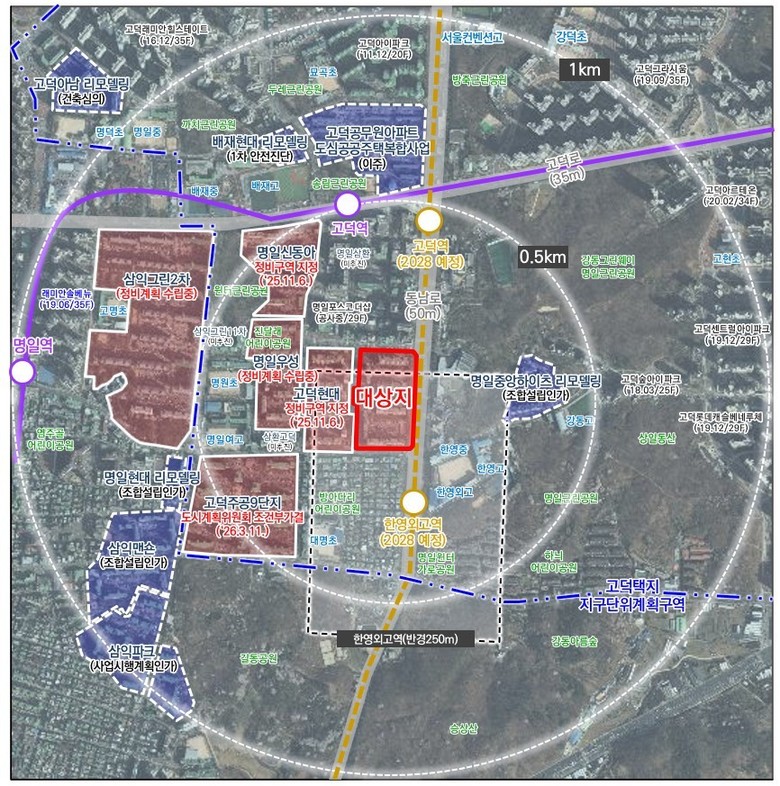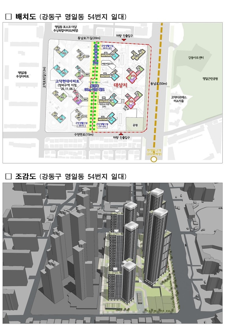 이번 정비계획은 먼저 결정된 고덕현대아파트 재건축사업(‘25.11.6.)과 도시 공간적 조화를 고려하고, 고덕택지 지구단위계획구역 내 재건축 개발과의 연계성을 반영해 수립됐다.