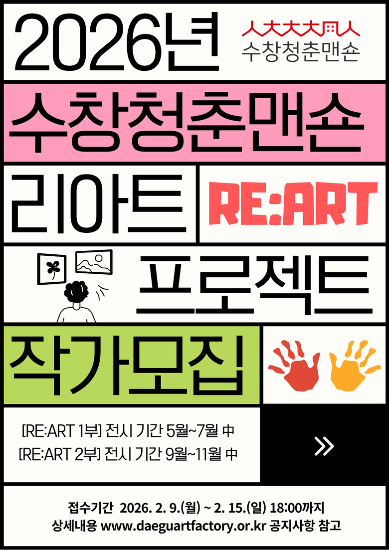 더불어 수창청춘맨숀에서도 <리 아트(RE:ART) 프로젝트>에 참여할 청년예술가를 공개 모집한다.