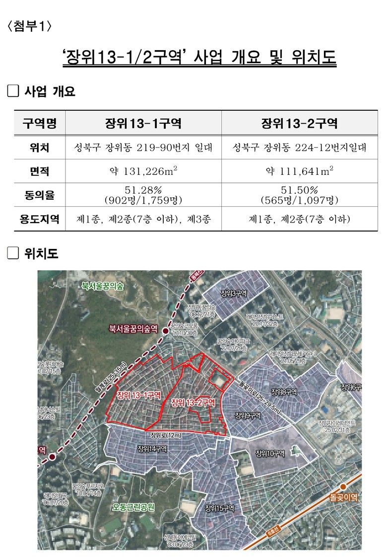 올해 4월 신속통합기획 재개발 후보지로 선정된 ‘장위13-1/2구역’은 장위 재정비촉진지구에서 해제됐던 6개 구역(총 92만㎡) 중 가장 늦게 재추진이 결정됐지만 서울시는 늦은 만큼 다각적인 지원으로 더 속도감 있는 사업 추진을 지원한다는 방침이다.