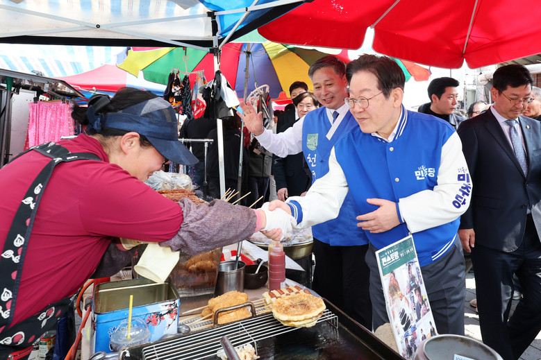 [담양 세계타임즈 = 심귀영 기자] 더불어민주당 이재명 대표가 22일 오전 전남 담양시장에서 이재종 후보 지원 유세를 하면서 상인과 악수를 하고 있다. 2025.3.22