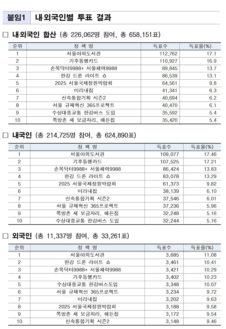 전체 투표자 중 외국인은 총 1만 1,337명으로 총 3만 3,285표를 투표했다. 외국인이 뽑은 최고의 정책 1위는 ‘서울야외도서관’으로 동일했고 2위는 ‘한강 드론 라이트 쇼’, 3위는 ‘손목닥터9988+서울체력9988’이었다. 이어 4위와 5위에는 ‘기후동행카드’, ‘수상대중교통 한강버스 도입’이 이름을 올렸다.