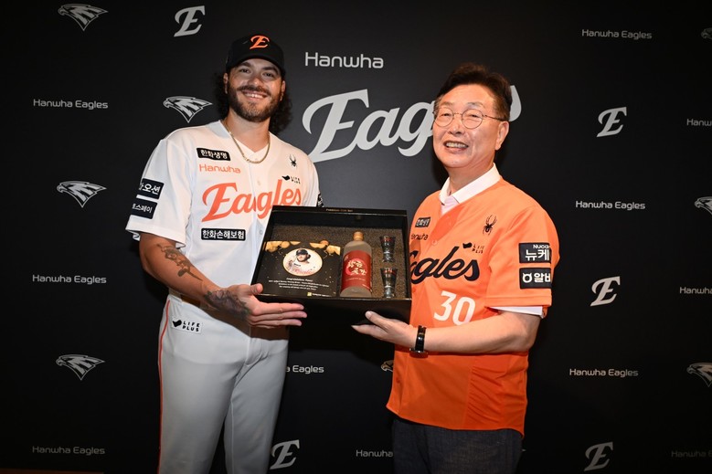 김제선 대전 중구청장은 지난 14일 대전한화생명볼파크를 찾아 폰세선수에게 축하와 감사의 글을 담은 패를 수여하고, 본인이 소장하고 있던 미술작품과 지역에서 생산한 증류주 세트를 선물했다.