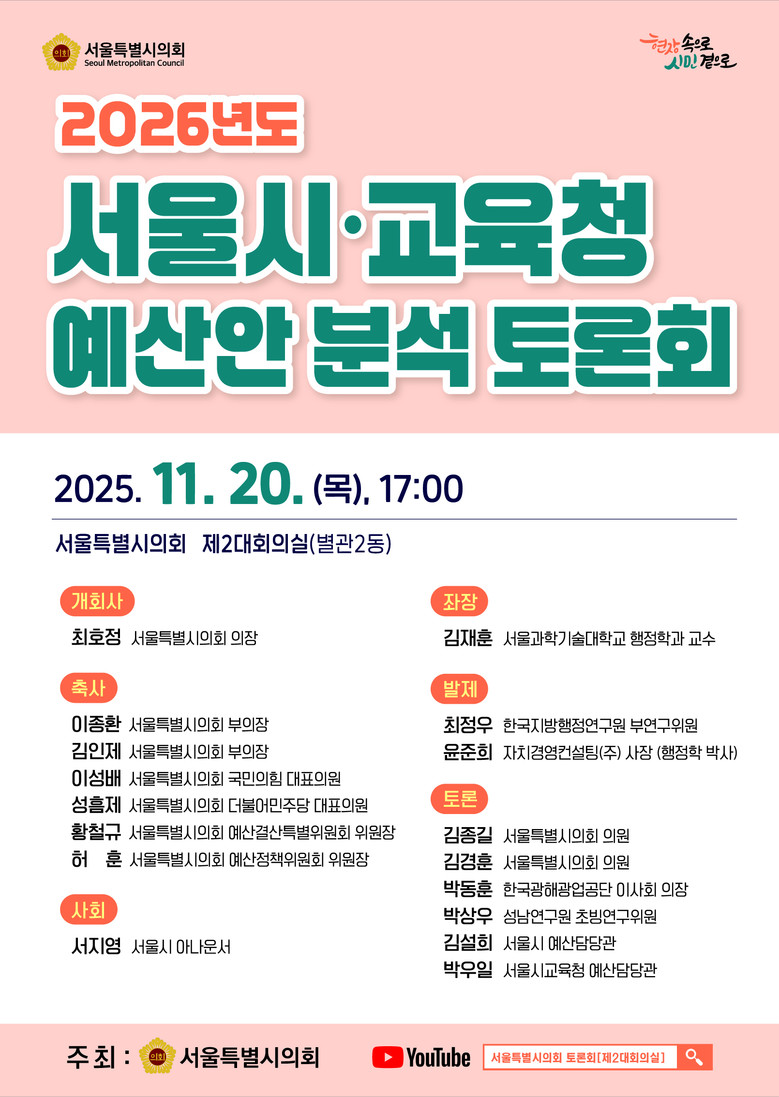 2명의 재정 전문가가 서울시와 교육청 예산안을 각각 분석 발표하며, 서울시의원, 재정 전문가, 공무원 등이 토론에 참여한다.
