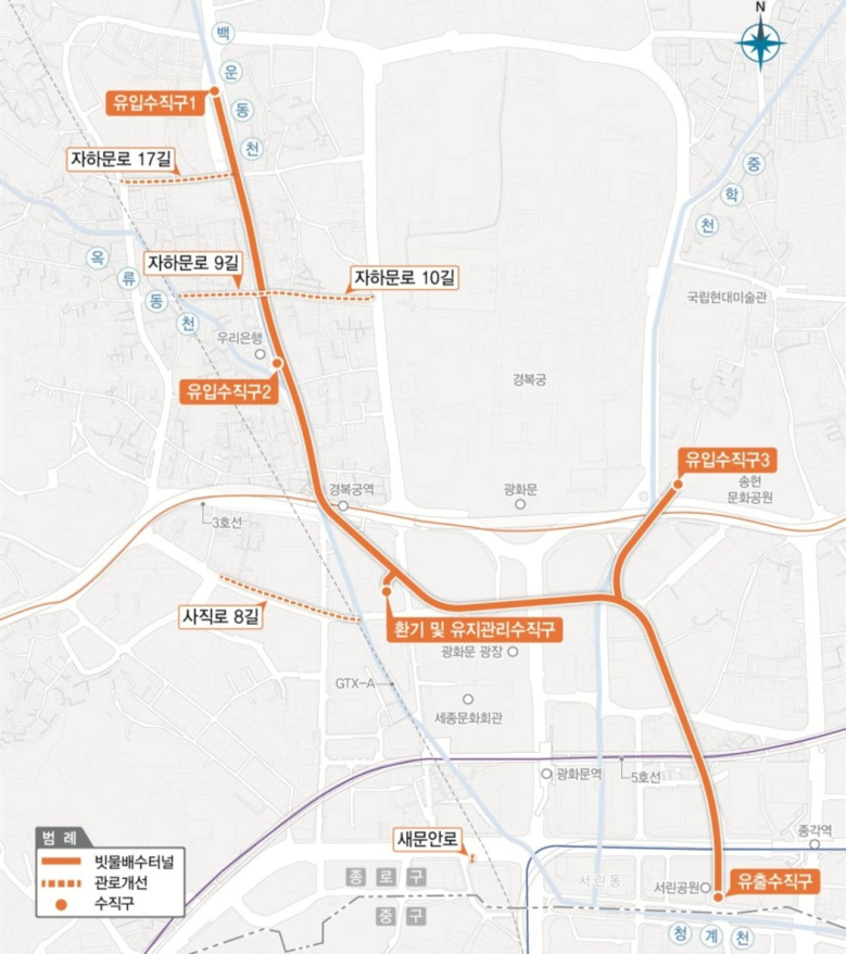 광화문 일대 대심도 빗물배수터널은 총 연장 2,321m, 면적 24,609㎡ 규모로, 송현문화공원–광화문광장–서린공원 등 광화문 중심부를 연결한다.