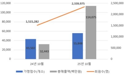 ▴누적 매출액 약 3.5배 증가(총 1,140억 7천만 원) ▴누적 주문 건수도 약 3.1배 늘었다(4,603,185건). 특히 ▴시장 점유율이 '24년 10월 2.34%에서 1년 새 '25년 10월 7.5%로 약 3.2배 늘면서 민간 플랫폼 경쟁 구도 속 확장세를 이어가고 있다.