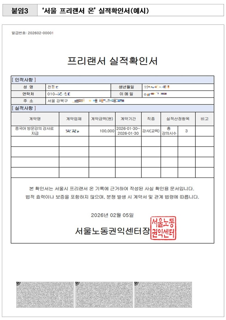 이해선 서울시 민생노동국장은 “이번 ‘서울 프리랜서 온’ 정식 오픈은 프리랜서와 의뢰인 간 대금 미지급, 실적 관리의 어려움을 동시에 해소하기 위한 서비스 개선의 결과로, 프리랜서도 실적을 인정받을 수 있는 길이 열렸다”며, 이는 “앞으로도 프리랜서 등 취약노동자가 현장에서 체감할 수 있는 지원 정책을 지속적으로 확대해 나가겠다”고 말했다.