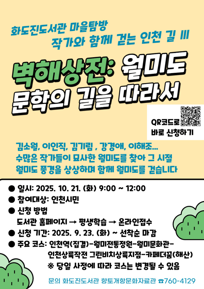 자세한 사항은 화도진도서관 누리집을 참고하거나 향토개항문화자료관(☎760-4129)으로 문의하면 된다.