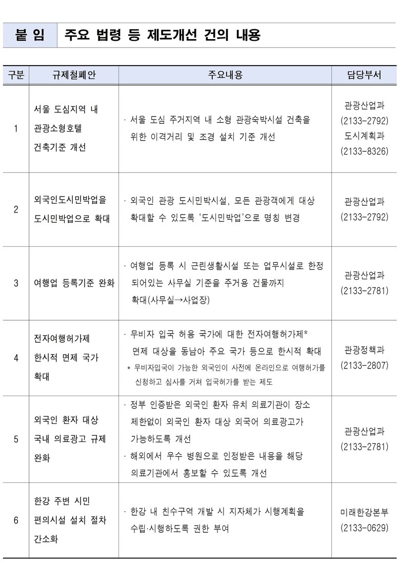 - 의료관광 활성화 위해 광고 기준 개선, 한강 이용 편의성 위해 시설 설치 규제 완화 건의