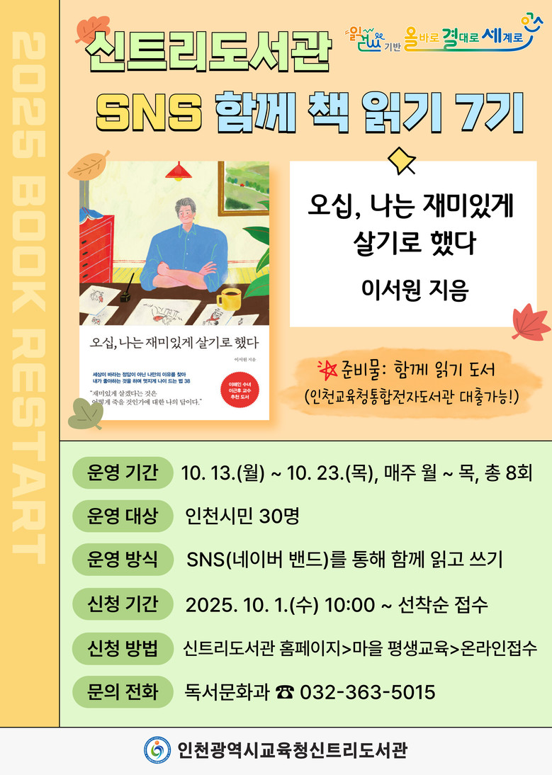 참여 신청은 10월 1일 오전 10시부터 신트리도서관 누리집(https://lib.ice.go.kr/shintree/index.do)에서 가능하며, 문의는 독서문화과(☎032-363-5015)로 하면 된다.