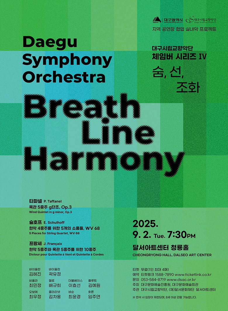 대구시향 ‘체임버 시리즈 Ⅳ : 숨, 선, 조화’는 전석 무료이며, 티켓링크(1588-7890, ticketlink.co.kr)에서 1인당 4매까지 예약할 수 있다. 만석 시 입장이 제한되고, 초등학생 이상 관람 가능하다.