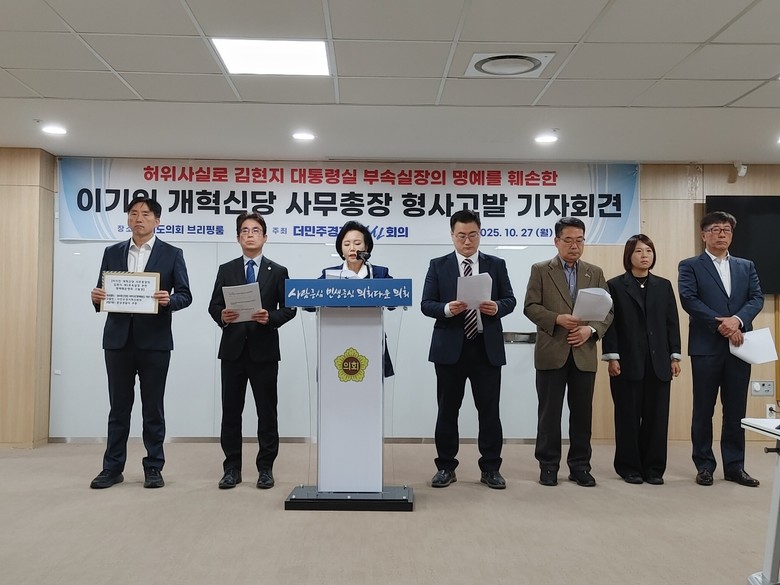 이날 정윤경 더민주경기혁신회의 공동상임대표는 회견문을 통해 “이기인 사무총장이 김현지 실장이 증거인멸 교사, 변호사 교체 개입, 불법 선거자금 모금 등을 한 것처럼 허위사실을 퍼뜨려 명예를 심각하게 훼손했다”며 “정치적 비판의 범위를 넘어선 악의적 인격 살인 행위”라고 규정했다.
