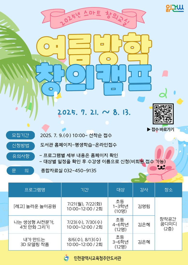 수업에 필요한 태블릿, 노트북 등 교구는 도서관에서 제공하며, 참여 신청은 7월 9일(수) 오전 10시부터 주안도서관 누리집(https://lib.ice.go.kr/juan)에서 가능하다.