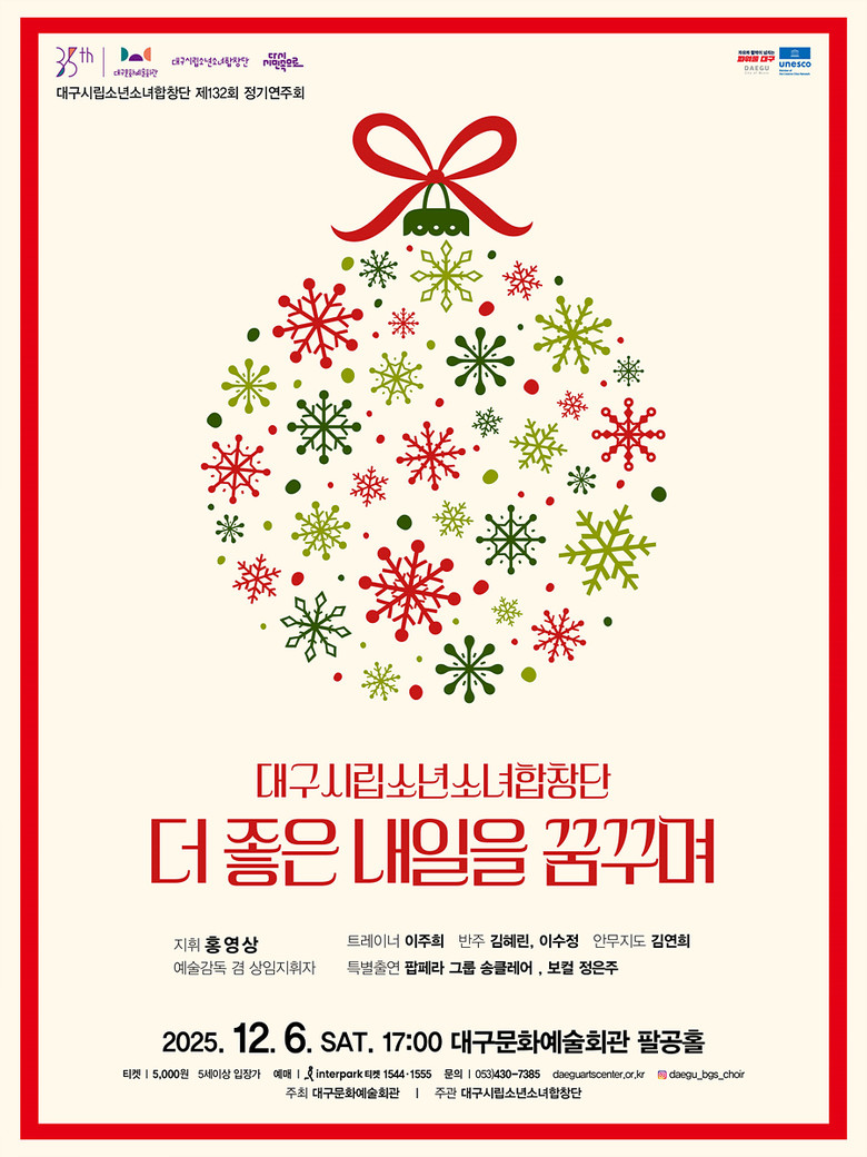 대구시립소년소녀합창단 제132회 정기연주회 ‘더 좋은 내일을 꿈꾸며’ 입장료는 5,000원으로 예매는 인터파크티켓을 통해 가능하다.