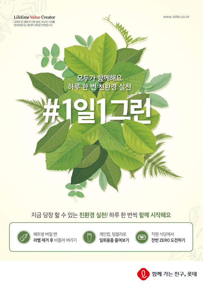 롯데는 우선 그룹 내 전 임직원들을 대상으로 이와 같은 친환경 활동에 대한 공감을 확산하고, 고객 접점이 있는 계열사를 활용해 고객들에게 롯데와 함께하는 쉽고 즐거운 친환경 활동을 전파해 나가겠다는 계획이다. 이에 따라 롯데는 전 임직원의 ‘1일1그린’ 실천이 가능한 과제로 △페트병 버릴 땐 라벨을 떼고 비틀어 버리기 △개인컵, 텀블러 사용해 일회용품 줄여보기 △직원 식당에서 잔반 Zero에 도전하기 를 우선 선정했다. 이 후 각 사에서 사별 특성에 맞춘 과제를 추가로 선정하여 추진해 나갈 예정이다. 또한 유통·관광 등 고객 접점이 있는 사업 분야의 계열사에서는 ‘쇼핑할 때는 에코백 가지고 가기’, ‘가볍게 손을 털어 티슈 사용 줄이기’ 등 고객을 대상으로 한 작은 실천 활동들도 지속적으로 발굴해 안내할 예정이다.