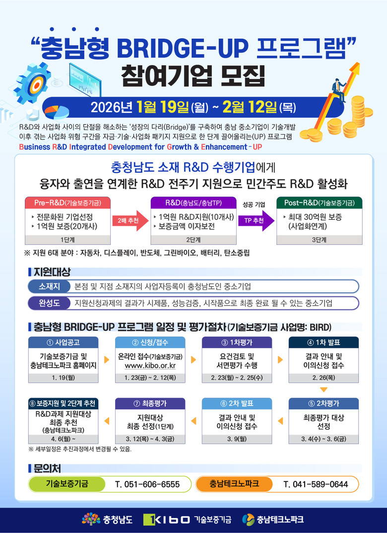 지원 분야는 자동차·디스플레이·반도체·그린바이오·배터리·탄소중립 등 6대 산업군으로, 오는 19일 관련 공고를 내고 기술보증기금 누리집(충남형 BIRD 프로그램)을 통해 2월 12일까지 신청받을 예정이다.
