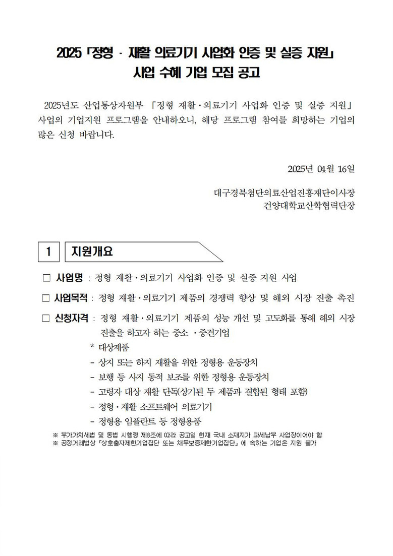 케이메디허브가 주관하고 건양대학교 산학협력단이 공동 수행기관으로 참여하는 이번 사업은 국내 정형·재활 의료기기의 성능 고도화 및 글로벌 경쟁력 강화를 목표한다.