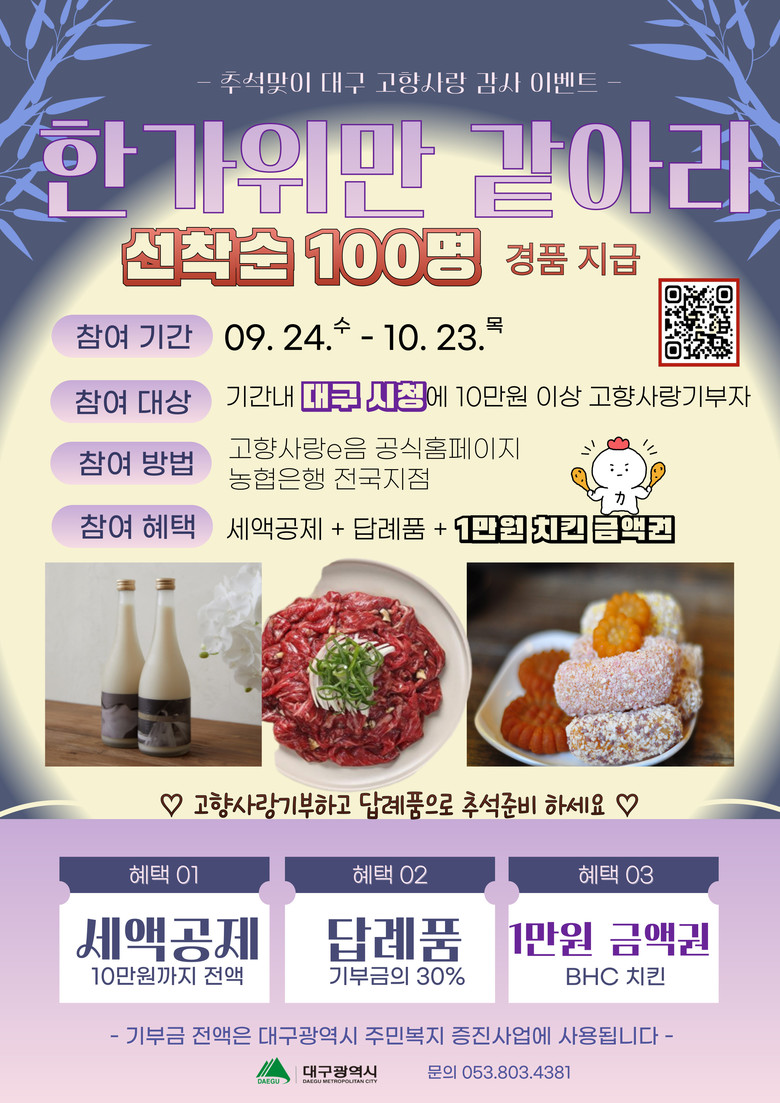 한편, 대구시는 민족 대명절인 추석을 맞아 고향사랑기부제 활성화와 기부 참여 확산을 위한 특별 이벤트도 마련했다. 이벤트 기간(9.24~10.23) 동안 ‘대구광역시청’에 10만 원 이상 기부한 선착순 100명에게는 1만 원 상당의 치킨 금액권이 지급된다.