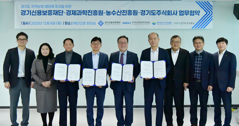 경기신보는 지난 8일 본점 대회의실에서 경기도경제과학진흥원, 경기도농수산진흥원, 경기도주식회사와 ‘경기도 지역 상생 생태계 조성을 위한 업무협약’을 체결했다고 밝혔다. 이날 행사에는 시석중 이사장을 비롯해 김현곤 경기도경제과학진흥원 원장, 최창수 경기도농수산진흥원 원장, 이재준 경기도주식회사 대표이사 등 관계자 20여 명이 참석했다.