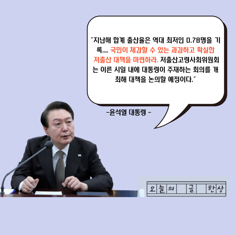 [세계타임즈 백진욱 기자] 8일(목) 현재 대한민국의 저출산 문제의 심각성이 다시한번 대두 되고 있는 가운데 윤석열 대통령이 저출산고령화사회위원회의 김영미 부위원장, 홍석철 상임위원, 위원회 간사위원인 조규홍 보건복지부 장관으로부터 위원회에게 저출산 대책과 운영방향을 마련하라고 밝혔다.