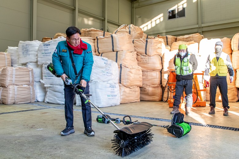 | ▲ 박강수 마포구청장이 제설창고를 찾아 제설 장비를 점검하며 겨울철 안전 대응 준비 상황을 확인하고 있다. |