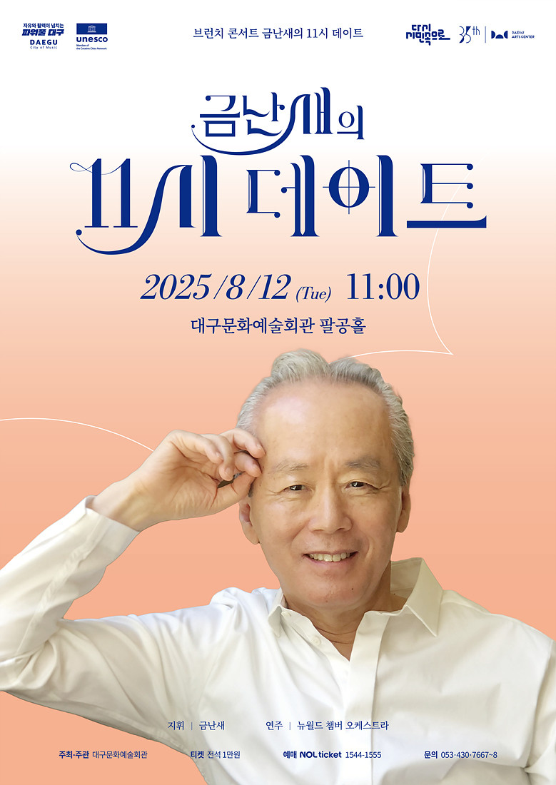 김희정 대구문화예술회관장은 “‘금난새의 11시 데이트’는 지난 2023년도부터 대구문화예술회관의 대표적인 마티네 프로그램으로 자리 잡아 많은 관객들의 꾸준한 사랑을 받아오고 있다”며, “이번 8월 공연 역시 한여름의 감성과 어울리는 다채로운 프로그램으로 관객 여러분께 시원한 클래식의 여운을 선사할 것”이라고 전했다.