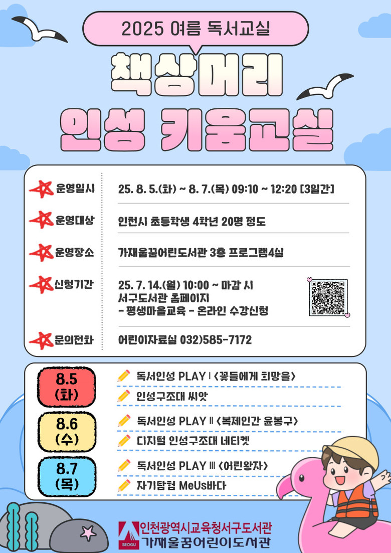 참여 신청은 7월 14일(월) 오전 10시부터 서구도서관 누리집(https://lib.ice.go.kr/seogu)에서 선착순 접수하며, 자세한 사항은 어린이자료실(☎032-585-7172)로 문의하면 된다.