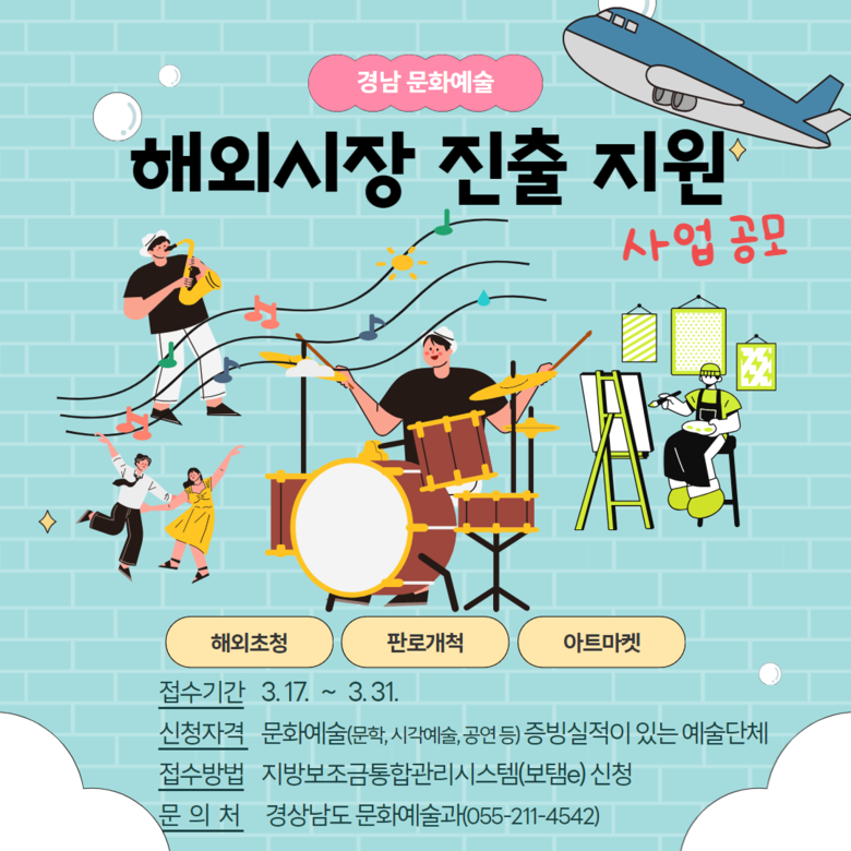 - 도내 우수 예술단체의 해외 공연·전시 및 아트마켓 개척 지원 [세계타임즈=경남 최성룡 기자] 경상남도(도지사 박완수)는 경쟁력 있는 도내 예술단체의 글로벌 확장을 견인하고 해외시장 판로 개척을 지원하는 ‘2025년 경남 문화예술 해외시장 진출 지원 사업’을 추진한다고 밝혔다.