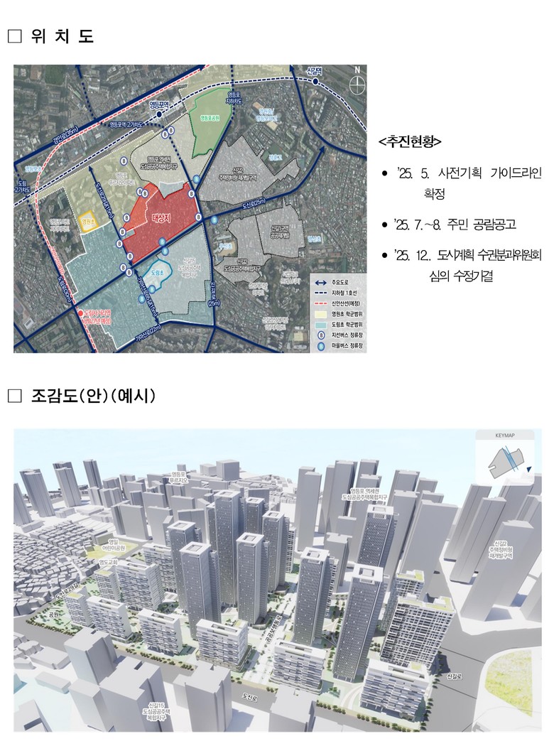 대상지 일대는 영등포역 남측 노후된 단독·다세대주택이 혼재되어 있고, 보행환경이 열악한 주택지이다. 2022년 8월 2차 공공재개발 후보지 선정 이후 분야별 전문가들이 참여하여 마련한 사전기획을 반영하여 정비계획을 수립했다.