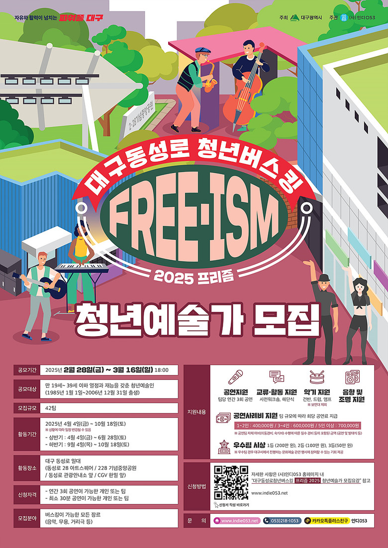동성로 청년 버스킹 참가신청은 오는 3월 16일(일) 18시까지 받으며 자세한 사항은 (사)인디053 홈페이지(www.indie053.net)를 통해 확인할 수 있다.