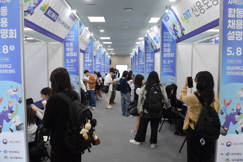 국토교통부가 주최하고 경북도와 대구시가 주관하는 이번 합동채용 설명회는 이전공공기관(16), 지역산하 공공기관(5), 지역기업(5) 등 총 26개 기관이 참여했으며, 취업준비생 3,000여 명이 방문해 높은 관심과 열기를 보였다.