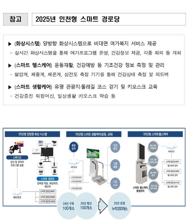 ‘인천형 스마트경로당’은 과학기술정보통신부가 주관한 2024년 공모사업에 선정되어 추진된 사업으로, 인천시는 지난해 100개소의 스마트경로당 구축을 완료했으며, 올해 1월부터 6월까지 시범 운영을 거쳤다.