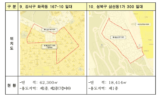 이번에 후보지로 선정된 곳은 ▴종로구(2개소) ▴중구(2개소) ▴강서구(2개소) ▴강북구(1개소) ▴중랑구(1개소) ▴구로구(1개소) ▴성북구(1개소) 등 총 10개소로, 앞으로 정비계획 수립 등의 절차를 통해 최종 사업지로 선정되면 본격적인 사업에 들어갈 계획이다.
