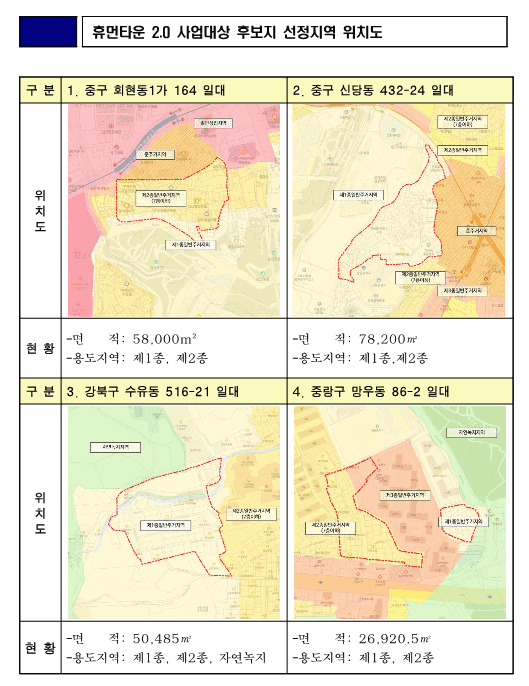 # 중구 회현동과 신당동은 남산 및 서울성곽과 인접한 지역적 특성으로 인한 각종 건축규제로 주거환경개선에 어려움을 겪고 있는 지역으로 이번 휴먼타운2.0 사업후보지로 선정됨에 따라 주택정비와 부족한 기반시설이 개선될 전망이다. # 서울에서 빈집이 가장 많은 곳으로 꼽히는 종로구는 문화재가 많다는 이유로 과거 재개발 허가를 해주지 않아 노후도가 심각한 지역인데, 이번에 휴먼타운2.0 사업 후보지로 2곳이 선정됐다. 특히 옥인동 47번지는 빈집도 많은데다 노후도가 심각해 주택 정비가 시급한 지역이다. # 김포공항 인접 지역이라 고도제한 등 각종 규제로 재개발이 어려웠던 강서구는 이번에 2곳이 후보지로 선정됐다. |