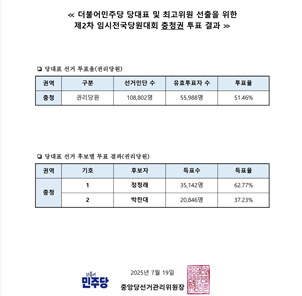 정 후보의 강력한 리더십 공약에 더해 국회 법제사법위원장과 윤석열 전 대통령 탄핵 심판 국회 탄핵소추위원장 활동을 하며 보여준 실제 추진력도 이번에 권리당원 투표에서 이긴 배경으로 꼽힌다. 박 후보의 경우 그동안 개혁 필요성과 방향에는 정 후보와 공감하면서도 집권 여당 대표로 국정은 뒷받침하기 위한 안정적 리더십을 강조해 왔다. 국민의힘 등 야당에 대해서도 협치를 추구하겠다면서 정 후보와 차별화했으나 결과적으로 충청권 당심 공략에는 실패했다.