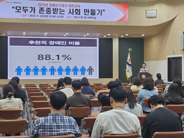 [연수구 세계타임즈=심하린 기자] 연수구(구청장 이재호)는 지난 18일 구청 대회의실에서 소속 공무원과 공무직 등 150여 명을 대상으로 장애인과 비장애인 간 상호 존중과 이해 증진을 위한 장애인식개선 교육을 했다.